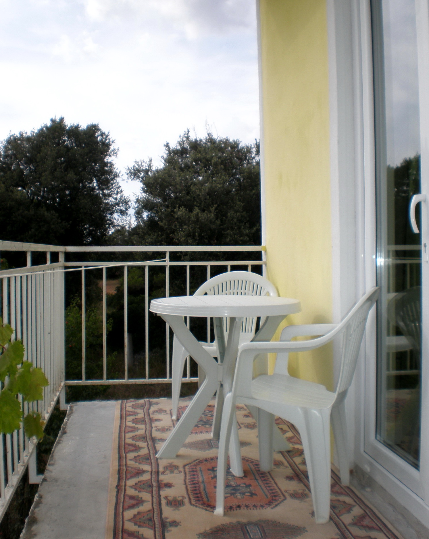 Apartment A3 = 2-room apartment, 50 sqm, in the first floor, for 3-5 guests:  living room with dining table and sofa bed, satellite TV, open kitchen (4 plate stove, fridge with freezer, kettle, crockery and cutlery), 1 bedroom with 1 double bed and 1 single bed, shower / WC, south-facing balcony with furniture, limited view of the sea.