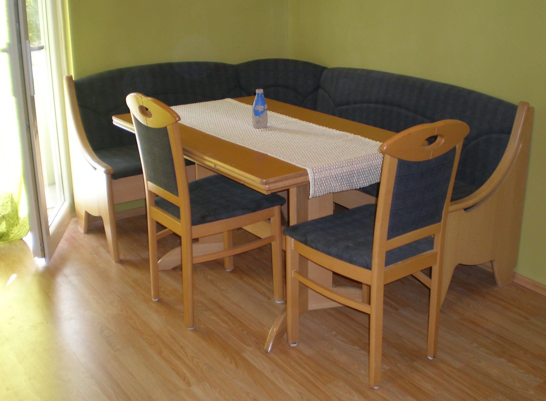 Ferienwohnung A3 = 2-Zimmer-Wohnung, ca. 50 qm groß, im 1. OG, für 3-5 Gäste:  Wohn- / Esszimmer mit Esstisch und Schlafcouch, SAT-TV, offene Küche (4-Platten-Herd, Kühlschrank mit Gefrierfach, Wasserkocher, Geschirr und Besteck), 1 Schlafzimmer mit 1 Doppelbett und 1 Einzelbett, Dusche / WC, Süd-Balkon mit Balkonmöbeln, eingeschränkte Sicht auf das Meer.
