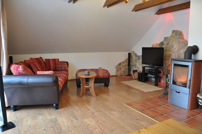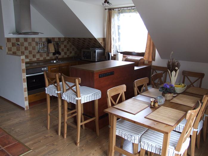 The comfortably furnished holiday house (built: 2009) with 3 holiday-flats is situated in the Slovak Paradise NP, in the tourist destination Košiarny Briežok, on a large plot of land in the forest, and is a good starting point for wonderful tours across the Slovak Paradise NP in the winter and in the summer. All guests can use the surraunding area with a shelted barbecue for each flat. The house is heated by central heating. Parking is on the property. The house is in winter easily accessible by car, one does not need snow chains. Up to Spišska Nova Ves it is about 3km. There are supermarkets, bakeries, cafés, reataurants, post offices, banks, fitness centers in town. A bus stop and a railway station in Smižany are just 1,5km from the house. On Košiarny Briežok there is a small restaurant - it is only 500m away from the house. The house is non smoking. Pets are not allowed. Towels and linen are provided. Minimum stay: 7 days. Arrival / Departure: Saturday. Rental price includes all costs: from € 450,00 per appartement / week + tax € 7,00 per person / week.