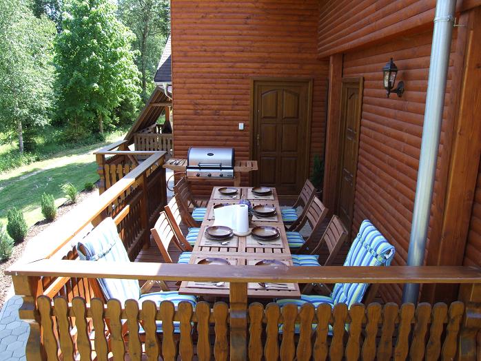 vchod, obývacia izba s posedením, krbom, jedálenským stolom a TV so satelitným príjmom, otvorená kuchyňa (sporák, rúra, chladnička s mrazničkou, rýchlovarná kanvica, mikrovlnná rúra, riad a príbory), 1 spálňa s 1 manželskou posteľou a pohovkou, 1 spálňa s 1 manželskou posteľou a pohovkou, 1 spálňa s 1 manželskou posteľou a poschodovou posteľou, 1 kúpeľňa / WC so sprchovacím kútom, vaňou a pračkou, balkón, terasa.