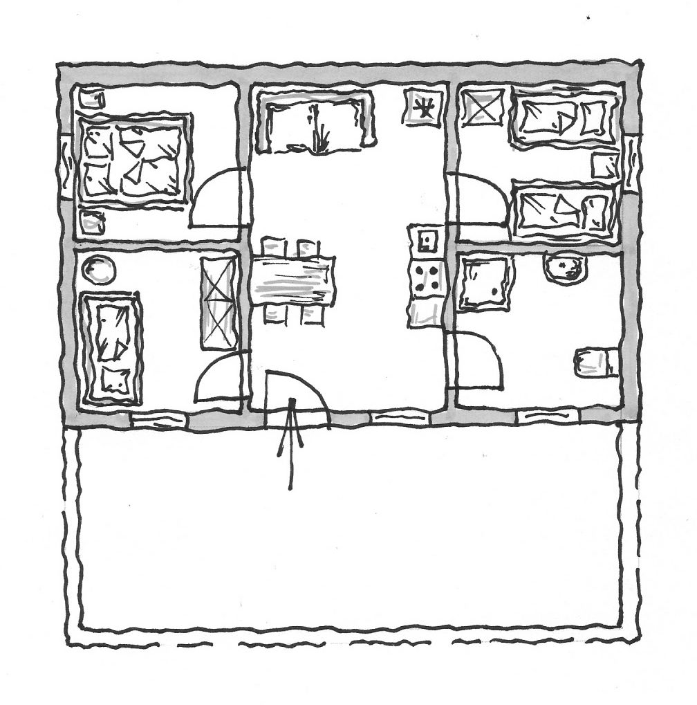 Apartment A1 = 4-room apartment, 80 sqm, ground floor, for 5-7 guests:  living room with sofa bed and dining table, TV, kitchen (cooker, fridge freezer, kettle, crockery and cutlery), 1 bedroom with 1 double bed, 1 bedroom with 2 single beds, 1 bedroom with 1 single bed, shower / WC, shaded terrace with patio furniture, good view of the sea.